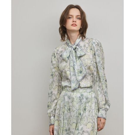 [型番:0126141209]繊細な線画調のフルーツフラワーのプリントをされた薄手のサテン素材。衿元の折り返しのようなデザインがポイントで、ボウタイリボンを外してもデザイン性のあるブラウスです。同シリーズでおつくりしたフルーツフラワープリントスカート【品番:0126121209】のご用意もございます。※こちらのモデル着用画像はサンプル品を撮影しております。実際の商品と仕様、加工、サイズが若干異なる場合がございます。予めご了承くださいませ。