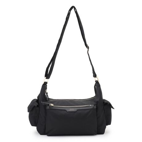 軽量ながらも実用性に優れたショルダーバッグです。軽くて丈夫なナイロン素材を使用しており、デイリーユースに最適です。必要なアイテムをしっかり収納できる程よいサイズ感で、日常使いに最適。バッグの前面には、スマートフォンやパスケースなど、すぐに取り出したいものを収納できるファスナーポケットを配し、機能性とセキュリティを両立させました。両サイドには、リップクリームやイヤホンといった小物の収納に便利な小ぶりなポケットを配置。デザインのアクセントとしても映え、使い勝手の良さを高めています。ショルダーストラップは長さの調節が可能で、肩掛けはもちろん、アクティブな斜めがけスタイルにも対応し、お買い物、お子様とのお出かけ、旅行など、様々なシーンでお使いいただけます。 カラーは、どんなスタイルにも合わせやすい定番のブラック(#005)と、上品で洗練された印象を与えるニュアンスカラーのグレージュ(#033)の2色展開です。