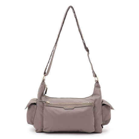 軽量ながらも実用性に優れたショルダーバッグです。軽くて丈夫なナイロン素材を使用しており、デイリーユースに最適です。必要なアイテムをしっかり収納できる程よいサイズ感で、日常使いに最適。バッグの前面には、スマートフォンやパスケースなど、すぐに取り出したいものを収納できるファスナーポケットを配し、機能性とセキュリティを両立させました。両サイドには、リップクリームやイヤホンといった小物の収納に便利な小ぶりなポケットを配置。デザインのアクセントとしても映え、使い勝手の良さを高めています。ショルダーストラップは長さの調節が可能で、肩掛けはもちろん、アクティブな斜めがけスタイルにも対応し、お買い物、お子様とのお出かけ、旅行など、様々なシーンでお使いいただけます。 カラーは、どんなスタイルにも合わせやすい定番のブラック(#005)と、上品で洗練された印象を与えるニュアンスカラーのグレージュ(#033)の2色展開です。