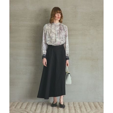 [型番:0226121023]【Japan Fabric】ふくらみ感のあるカルゼ織の素材を使用したイレギュラーフレアスカート。ヒップラインはすっきりとしているため、丈が長めのプルオーバーなどと合わせやすいデザイン。※こちらのモデル着用画像はサンプル品を撮影しております。実際の商品と仕様、加工、サイズが若干異なる場合がございます。予めご了承くださいませ。