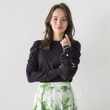 さりげない華やかさを添える、シャーリングで表現したパフスリーブがデザインポイント。