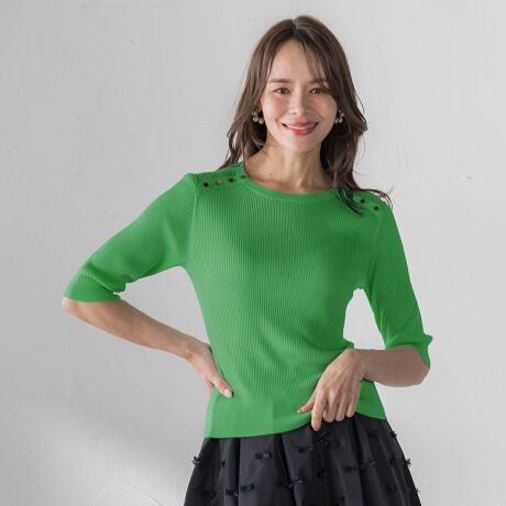 心地よい着用感のリブ組織で編み立て、肩のメタルボタンデザインがポイントです。