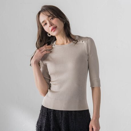 心地よい着用感のリブ組織で編み立て、肩のメタルボタンデザインがポイントです。