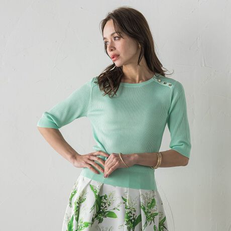 心地よい着用感のリブ組織で編み立て、肩のメタルボタンデザインがポイントです。