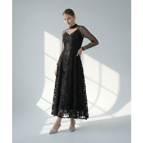 立体的なレースに繊細なスパンコールがきらめくキャミソールドレスに、シアー素材のトップスを重ねたエレガントな一着