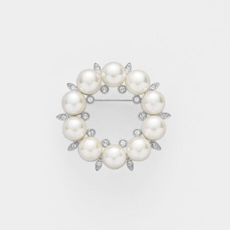 艶やかな輝きの貝パールと煌めくカットガラスが整然と並んだ、モダンな印象のブローチ。