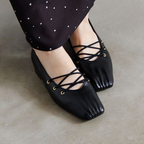 上質な一枚革で柔らか【卑弥呼26SS】クロスゴムフラットパンプス/661106