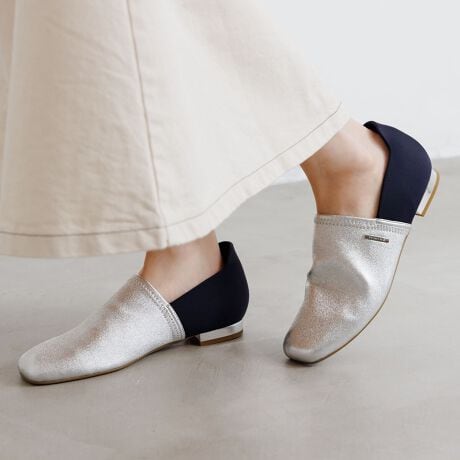 ブラック、ダークブラウンはワンカラーで仕上げ、シックな印象に。アイボリーはブラウンとのバイカラー、シルバーはネイビーとのバイカラーでおしゃれな足元を演出します。HIMIKOオリジナルメタルパーツとミラーヒールがきらりと光り、女性らしさをプラス。手を使わずに一瞬で履ける、忙しい日常に最適なアイテムです。