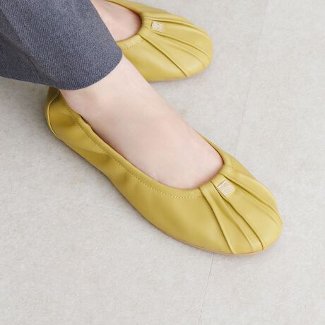 馴染みの良いシープレザーを使用した、柔らかな履き心地のフラットパンプス。足を包み込むようなギャザーデザインが特徴で、吸い付くようなフィット感を実現。