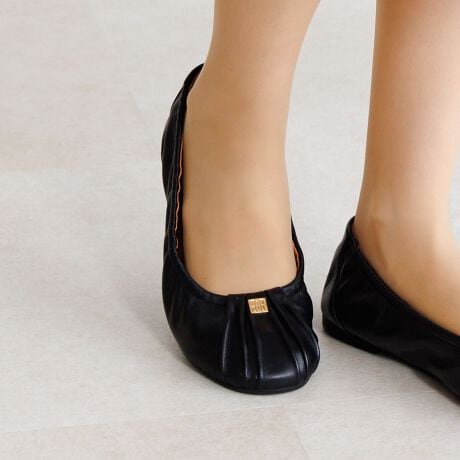 馴染みの良いシープレザーを使用した、柔らかな履き心地のフラットパンプス。足を包み込むようなギャザーデザインが特徴で、吸い付くようなフィット感を実現。
