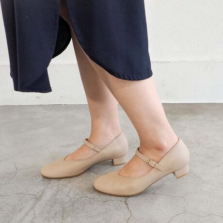 やさしい丸みのラウンドトゥに、ストラップを合わせた安定感のあるパンプス。