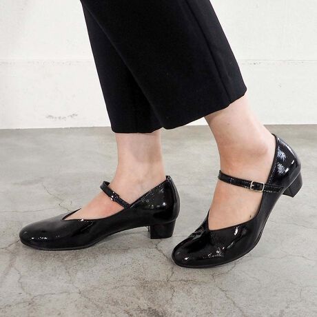 やさしい丸みのラウンドトゥに、ストラップを合わせた安定感のあるパンプス。