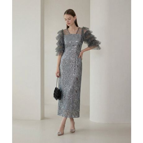 備考:チュールフリルスリーブ / スパンコール総刺繍 / シアーデコルテ / Iラインシルエット