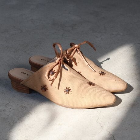 繊細なビーズ刺繍とメタルスタッズが目を引く一足。