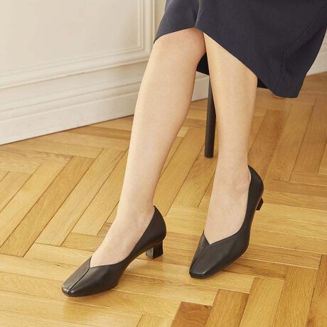 スクエアトゥとVカットで足元をすっきり見せてくれるプレーンパンプス。