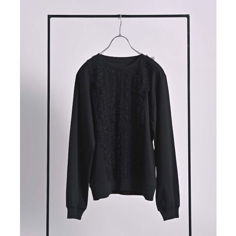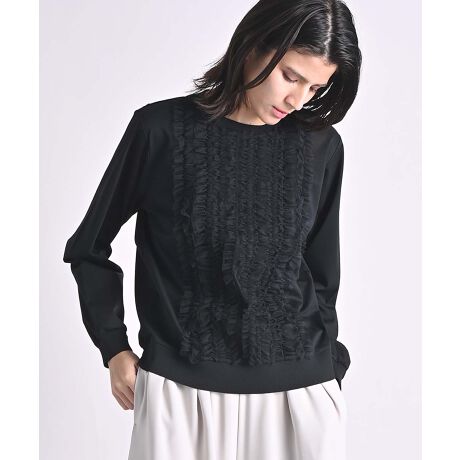 身頃いっぱいに巾の異なるチュールフリルを叩きつけた、存在感のあるプルオーバー。