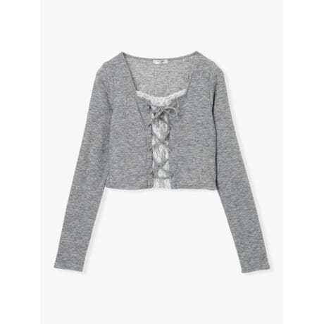 [型番:26560777823]1枚でレイヤード風の着こなしを楽しめるレーストップス。フロントはスピンドルを施しており、ガーリーなムードを高めています。凹凸のあるテレコ素材がフィット感のある着心地を実現。首元にネックレスやチョーカーをプラスしたコーディネートもおすすめです。