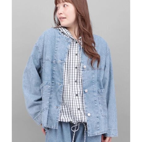 ポケットのステッチがアクセントのノーカラーデニムジャケット。