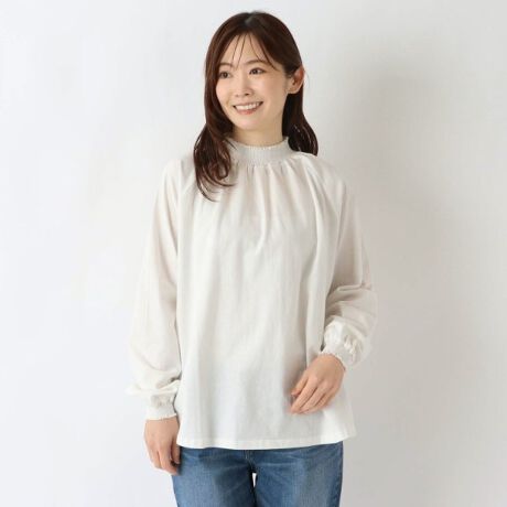襟と袖ロのシャーリングがかわいいプルオーバー。