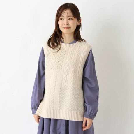 4種のニットをコンビしたニットベスト。異なる編み時を組み合わせたパッチワークデザインです。それぞれの質感が絶妙なコントラストを生み出し、着るだけでスタイルに奥行きを与えてくれます。