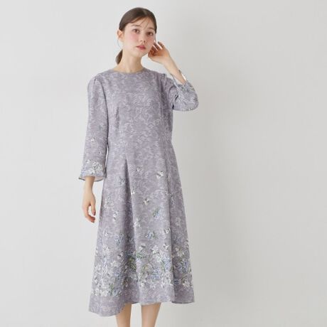袖と裾に繊細な花柄を施したパネル柄のプリントワンピース。