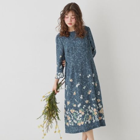 袖と裾に繊細な花柄を施したパネル柄のプリントワンピース。