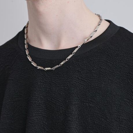 首元に確かな存在感を添える、デザイン性の高いチェーンネックレス。
