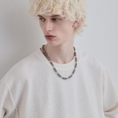 首元に確かな存在感を添える、デザイン性の高いチェーンネックレス。