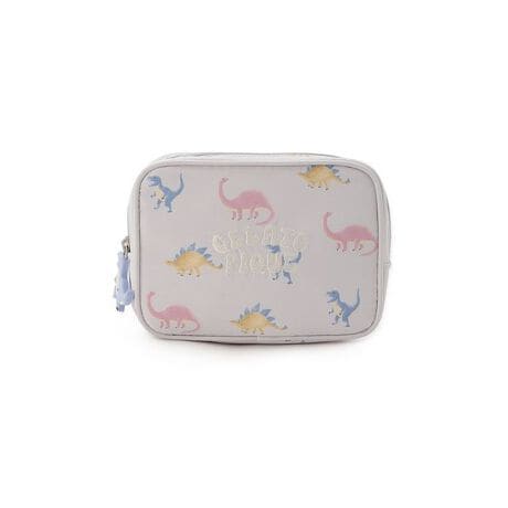 カラフルなダイナソーたちをプリントした総柄ポーチです。ブルーのティラノサウルス、ピンクのブラキオサウルス、イエローのステゴサウルスを組み合わせたPOPなプリント柄。フロントにはブランドロゴの刺繍を配し、ファスナーの持ち手にはティラノサウルスのチャームが付いています。ポーチはコスメなどが入れやすいマチありの長方形型で、内ポケット付き。色はクリームとブルーの2色をご用意しました。同シリーズのルームウェアや雑貨と合わせたり、ギフトにもおすすめのアイテムです。