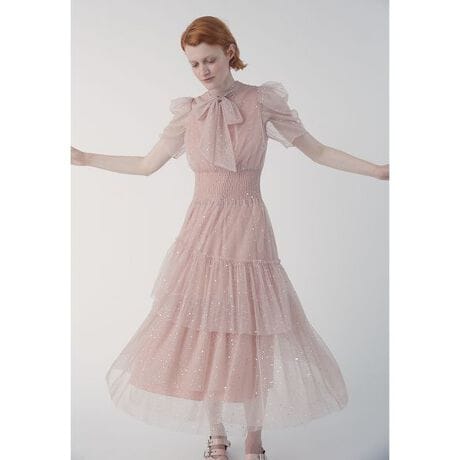 全体に散りばめられたラメが輝きを放ち、ロマンティックムードを盛り上げるドレス。ウエストシャーリングでメリハリのあるシルエットに。前後どちらでも結べるボウタイが華やぎを添えるポイントとなっております。結婚式やオケージョンシーンにもおすすめのアイテムです。