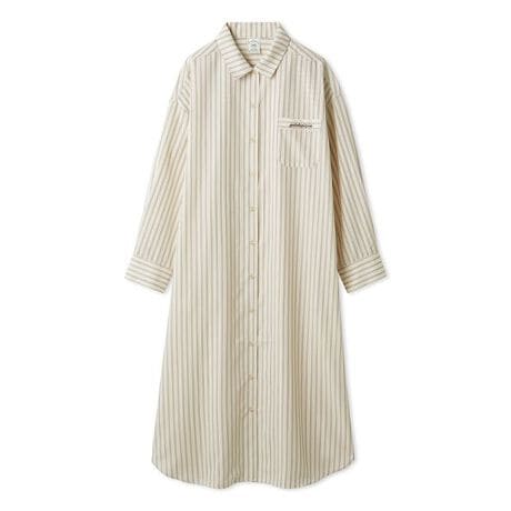 毎日のルームウェアに合わせやすい、ベーシックな細ピッチのストライプをあしらった布帛シリーズです。ゆったり大きめのサイズ感で仕上げた、カフス付きのシャツワンピース。肌を露出しすぎないロング丈で、軽い羽織りとしても着用いただけます。胸ポケットに配したロゴ刺繍がさりげないアクセント。柔らかくなめらかな肌触りにもこだわりました。色は大人っぽく落ち着きのあるアイボリーと、春に似合う爽やかなブルーの2色をご用意。同時期に展開するアランニットのシリーズとのコーディネートもおすすめです。