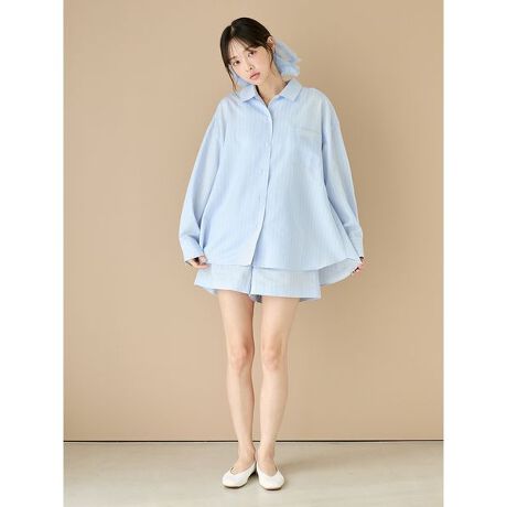 毎日のルームウェアに合わせやすい、ベーシックな細ピッチのストライプをあしらった布帛シリーズです。ベーシックなシルエットのショートパンツは、これから春先にかけて気持ち良く着用いただけるアイテム。両脇にポケット付きで、右後ろのポケットにロゴ刺繍が入っています。柔らかくなめらかな肌触りにもこだわりました。色は大人っぽく落ち着きのあるアイボリーと、春に似合う爽やかなブルーの2色をご用意。同シリーズのシャツと合わせたり、同時期に展開するアランニットのシリーズとのコーディネートもおすすめです。