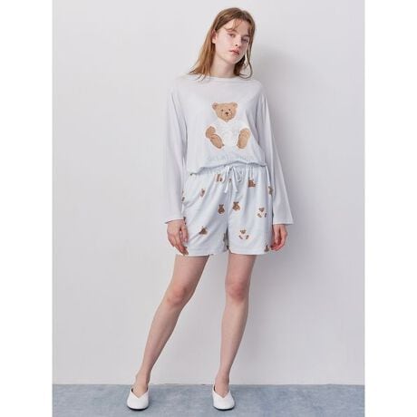 バスローブやアイマスクを身につけたり、リラックスしてお座りしているベアを散りばめた総柄プリントのショートパンツ。伸縮性に優れたなめらかな風合いの生地に、抗菌・防臭機能を備えました。両脇と右後ろにポケット付きで、家事や作業をしたい時にも便利。春の陽気のような爽やかさと清潔感を感じさせる絵柄が、心休まるおうち時間を演出します。色は柔らかな風合いのオフホワイトとブルーの2色。同シリーズのロングTシャツや、同時期に展開するスムーズィー2ボーダーシリーズとコーディネートしてお楽しみください。春の新生活に向けたギフトにもおすすめのアイテムです。