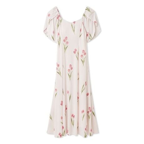 色とりどりのチューリップが春の到来を告げる、爽やかなガーデンのようなプリント柄シリーズです。薄手の涼しげなレーヨン混素材を使用した、するんととろけるような肌触りのカップインワンピース。首元を華奢に見せる上品なネックラインは、背中側にギャザーを入れて柔らかなフィット感に仕上げています。花びらを重ねたような、揺れるチューリップ袖もポイント。スタイルアップして見える美シルエットをお楽しみください。色はイエローとピンク、パープルの3色をご用意しました。