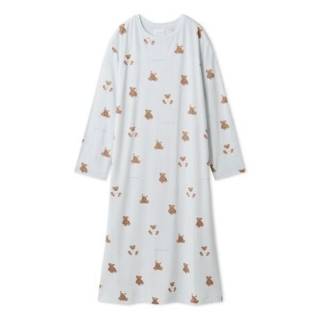 バスローブやアイマスクを身につけたり、リラックスしてお座りしているベアを散りばめた総柄プリントのワンピース。伸縮性に優れたなめらかな風合いの生地に、抗菌・防臭機能を備えました。長めの丈感とゆったりとした身巾で、1枚でも着用いただけるアイテム。春の陽気のような爽やかさと清潔感を感じさせる絵柄が、心休まるおうち時間を演出します。色は柔らかな風合いのオフホワイトとブルーの2色。同時期に展開するスムーズィーのカーディガンやパーカを合わせたり、春の新生活に向けたギフトにもおすすめのアイテムです。