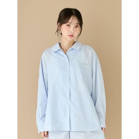 毎日のルームウェアに合わせやすい、ベーシックな細ピッチのストライプをあしらった布帛シリーズです。ゆったり大きめのサイズ感で仕上げたカフス付きのシャツは、胸ポケットに配したロゴ刺繍がさりげないアクセント。柔らかくなめらかな肌触りにもこだわりました。色は大人っぽく落ち着きのあるアイボリーと、春に似合う爽やかなブルーの2色をご用意。同シリーズのショートパンツと合わせたり、同時期に展開するアランニットのシリーズとのコーディネートもおすすめです。