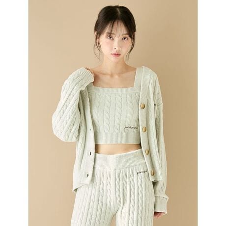 さらっとした肌触りの‘エアリーモコ’を使用した、軽やかな着心地のアラン柄ニットシリーズです。コンパクトなシルエットでトレンドライクな着こなしを楽しめるショート丈のビスチェ。ストライプ調のすっきりとした柄で、同シリーズのカーディガンやパンツと合わせやすい丈感になっています。左裾にワンポイントでロゴ刺繍を入れ、スタイリッシュな雰囲気に仕上げました。色は春を感じさせるアイボリーとミント、ブルーの3色展開。同シリーズのカーディガンやボトムを合わせてお楽しみください。