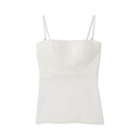 シアーファンデシリーズに待望のノンワイヤータイプが新登場。軽やかな着け心地ながら、ファッション性にもこだわり“見せるランジェリー”として楽しめるキャミソールです。保形性のあるモールドカップを内蔵し、ボディ全体には程よく伸びるパワーネット生地を使用。お腹部分は1枚仕立てでシアーに透けるデザインがポイントで、レイヤードのアクセントとしても活躍します。ストラップは取り外し可能で、ベアトップとしても着用できる2WAY仕様。インナーとしても1枚着としても使える、汎用性の高い万能アイテムです。