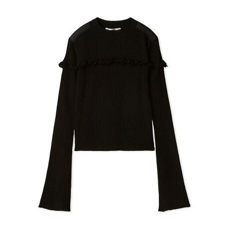 コンパクトなシルエットで、さまざまなアイテムとのコーディネートに活躍するシアーリブニットです。フロントから袖にかけてフリルをあしらい、さりげない装飾で華やかさをプラス。透け感のあるリブ素材が軽やかさを演出し、フェミニンな印象を引き立てます。インでもアウトでも着やすく、スタイリングに幅を持たせる1枚です。