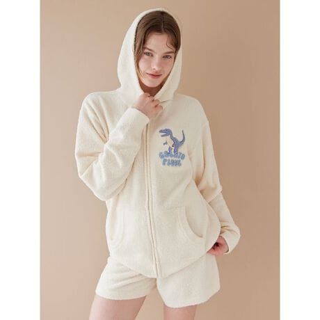 カラフルなダイナソーをモチーフにした、‘エアリーモコ’素材のニットシリーズです。フードに恐竜のようなトゲトゲのデザインをあしらった、ダイナソー気分でお楽しみいただけるジップパーカ。フロントにパッチポケット付きのゆったりとしたサイズ感で、ボディカラーごとに異なるダイナソーをモチーフにしたサガラ刺繍が入っています。ボディカラーは青いティラノサウルスを描いたクリームと、ピンクのブラキオサウルスを描いたブルー、イエローのステゴサウルスを描いたカーキの全3色。同シリーズのショートパンツや、ダイナソー柄のカットソーアイテムと合わせてお楽しみください。