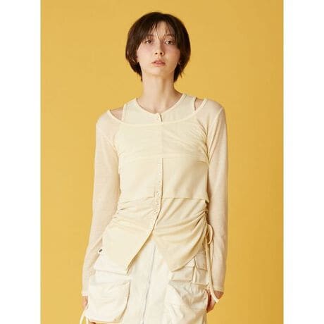 トレンドのレイヤードセットアイテム。トップスは柔らかく着心地良いガーゼ天竺。インナーは繊細なリブ素材となっています。トップスはインナーと組みわせた時もバランス良く着こなせる短丈シルエット。インナーは前開きなので単品でベスト感覚でお手持ちのアイテムとコーディネートするのもおすすめです。脇のドロスト紐でギャザーを寄せてシルエット変化も楽しめます。