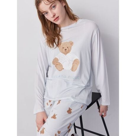 バスローブを着て、お部屋でリラックス時間を過ごすベアをプリントしたロングTシャツです。春の陽気のような爽やかさと清潔感を感じさせる絵柄が、心休まるおうち時間を演出。伸縮性に優れたなめらかな風合いのカットソーに、抗菌・防臭機能を備えました。色は柔らかな風合いのオフホワイトとブルーの2色。同シリーズのボトムや、同時期に展開するスムーズィー2ボーダーシリーズとコーディネートしてお楽しみください。春の新生活に向けたギフトにもおすすめのアイテムです。