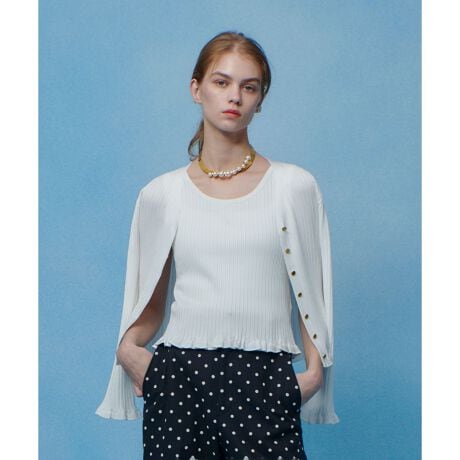 艶感のあるブライトレーヨン素材のワイドリブ。体にピタピタと張り付かず、冷たいサラリとした肌触り。ベーシックなシルエットながら、裾口とお袖口に小さいフリルをあしらい、エレガントに仕上げました。釦全留めでプルオーバーの様に着るのも素敵。艶やかな素材感を活かして発色の良いカラー展開にしました。
