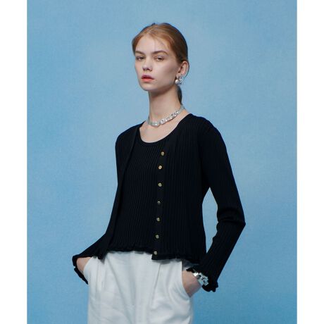 艶感のあるブライトレーヨン素材のワイドリブ。体にピタピタと張り付かず、冷たいサラリとした肌触り。ベーシックなシルエットながら、裾口とお袖口に小さいフリルをあしらい、エレガントに仕上げました。釦全留めでプルオーバーの様に着るのも素敵。艶やかな素材感を活かして発色の良いカラー展開にしました。