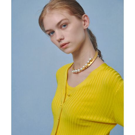 艶感のあるブライトレーヨン素材のワイドリブ。体にピタピタと張り付かず、冷たいサラリとした肌触り。ベーシックなシルエットながら、裾口とお袖口に小さいフリルをあしらい、エレガントに仕上げました。釦全留めでプルオーバーの様に着るのも素敵。艶やかな素材感を活かして発色の良いカラー展開にしました。