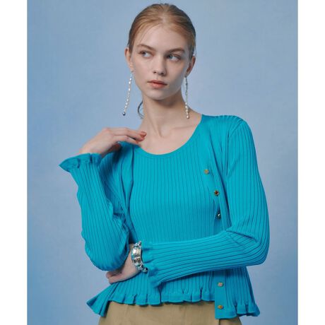 艶感のあるブライトレーヨン素材のワイドリブ。体にピタピタと張り付かず、冷たいサラリとした肌触り。ベーシックなシルエットながら、裾口とお袖口に小さいフリルをあしらい、エレガントに仕上げました。釦全留めでプルオーバーの様に着るのも素敵。艶やかな素材感を活かして発色の良いカラー展開にしました。