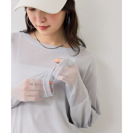 身頃はスラブ調のシアー素材、袖口切り替え部分はラメメッシュ素材。
