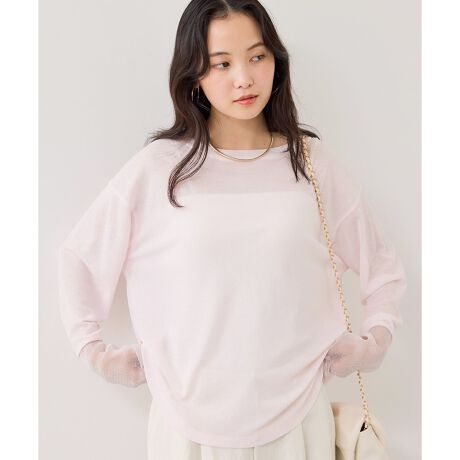 身頃はスラブ調のシアー素材、袖口切り替え部分はラメメッシュ素材。