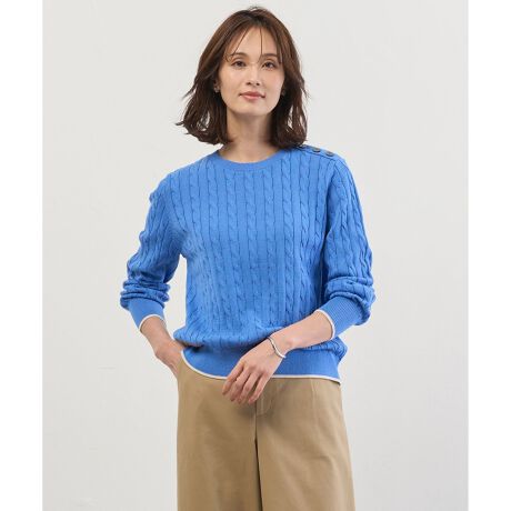 クラシックなケーブル編みが魅力のニット。今年は、糸の太さを一回り細くすることで厚みを抑えつつ、よりスマートで洗練された印象にアップデートしました。デザインのアクセントとして、肩にはポイントとなる釦を配し、さりげない配色もプラス。1枚で着映えするデザインに仕上げました。季節の変わり目に大活躍し、上品で洗練された大人のカジュアルスタイリングを楽しんでいただけるアイテムです。カラーは、柔らかく女性らしいピンク(#012)、顔周りを明るくするブラッドオレンジ(#020)、上品でやさしい印象のライトベージュ(#033)、爽やかな春色のスモーキーミント(#062)、知的でクリーンな印象のブルー(#070)の5色展開です。