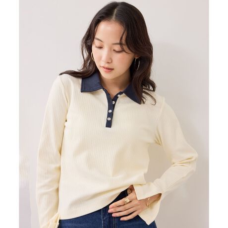 ボディ、襟ともにカットソー素材。ボディはテレコカットソーで縦のラインを強調し、伸縮性もある肌触りの良い素材です。